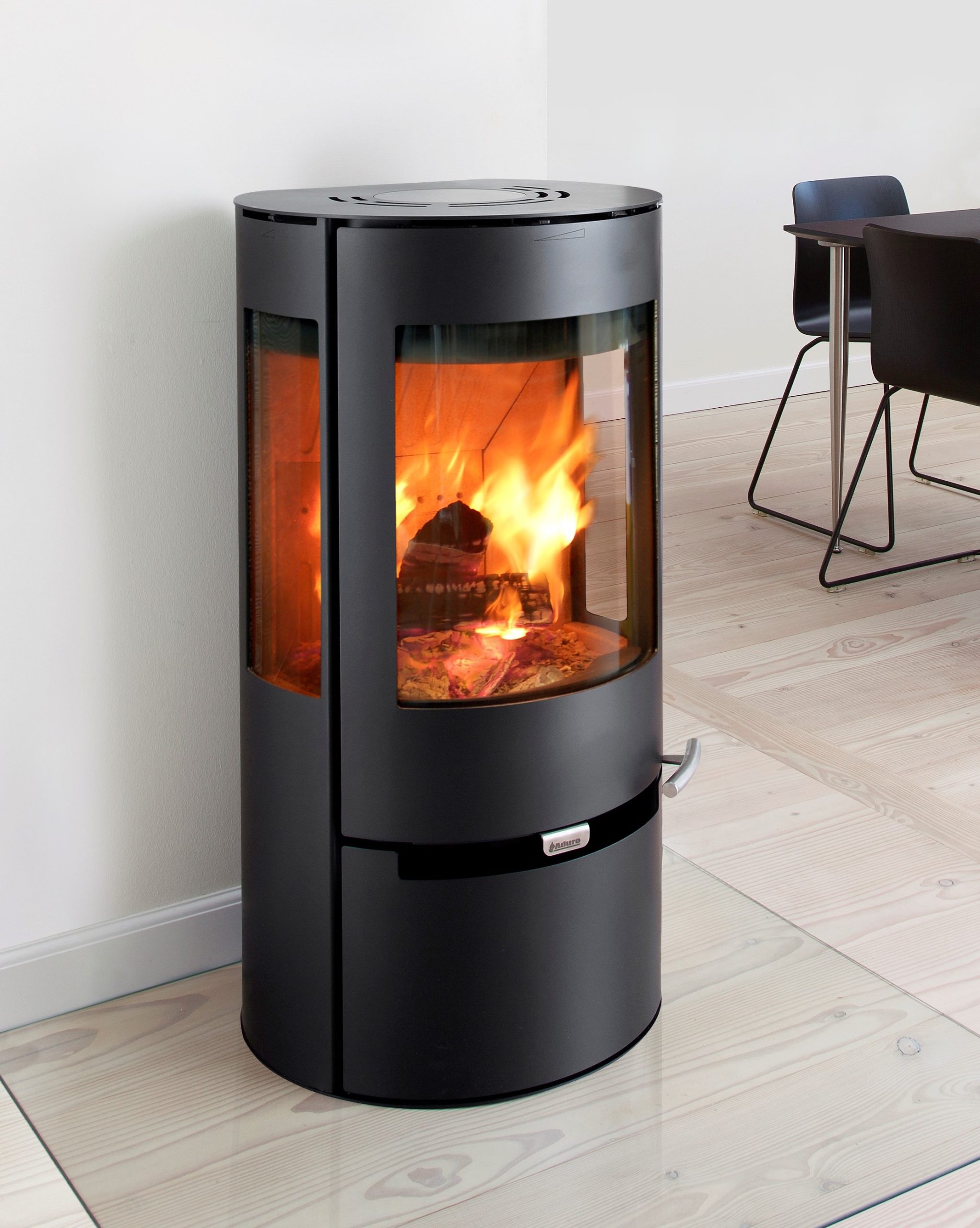 The Aduro 9 stove is a stylish and efficient wood-burning stove designed for modern homes. It has a rounded body with three curved glass panels that maximize the visibility of the flames. The stove can draw combustion air directly from outside, making it suitable for well-insulated homes. It has a nominal heat output of 6kW and an efficiency rating of 81.5%, making it DEFRA approved for smoke-controlled areas. The Aduro-tronic system helps reduce firewood usage by 40% and cam be connected to a smartphone app for monitoring combustion data. It is available with an external air supply option, ensuring optimal combustion.