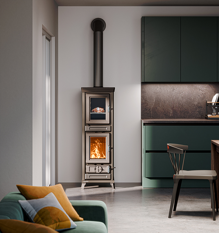Wood stove made of steel and cast iron with wide exchange surface and long forced smoke path, with a special stainless steel heater exchange, anti-breakage combustion chamber in cast iron, controls for the regulation of primary, secondary and tertiary air, vintage look steel handles, shake grate, enamelled cast iron door with 750 °C resistant ceramic glass, and top finished in enamelled cast iron. Practical food warmer in enamelled cast iron.