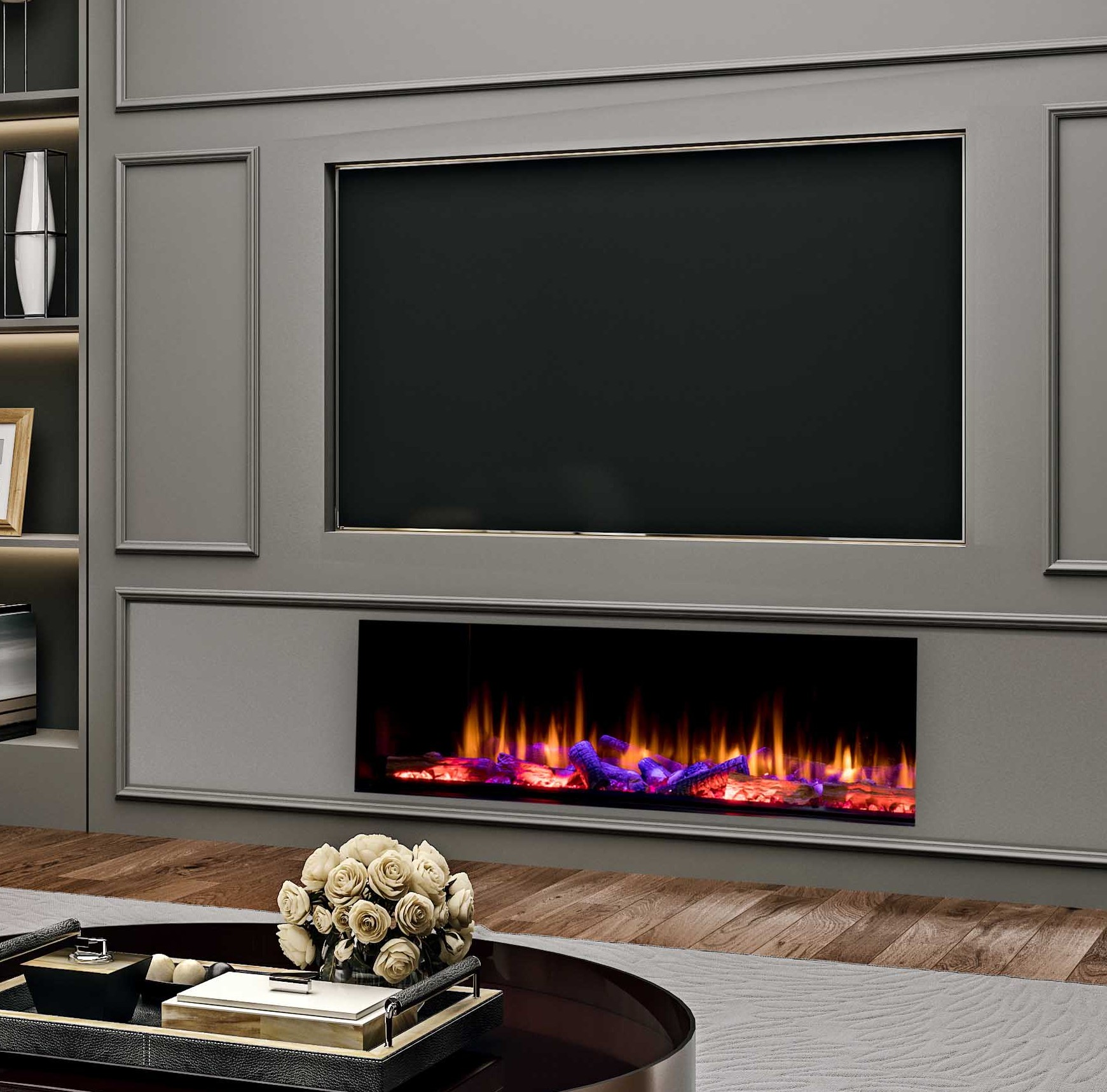 The Iconic range  of contemporary electric fires have been designed to satisfy the most discerning homeowner. Featuring the latest technology and available in four sizes, the options are boundless. The fire comes front facing as standard but can be transformed to a panoramic, left or right corner. The choice of size options in the Iconic range makes it versatile and provides endless possibilities. Choose from the 750, 1000, 1250 or 1600 to create your own bespoke living space. Each fire comes with ultra-realistic hand painted logs and large crystals. Choose from 13 different fuel bed colours to suit your personal style. Enhance the ambience by choosing from 7 different downlighter colours on your handset.