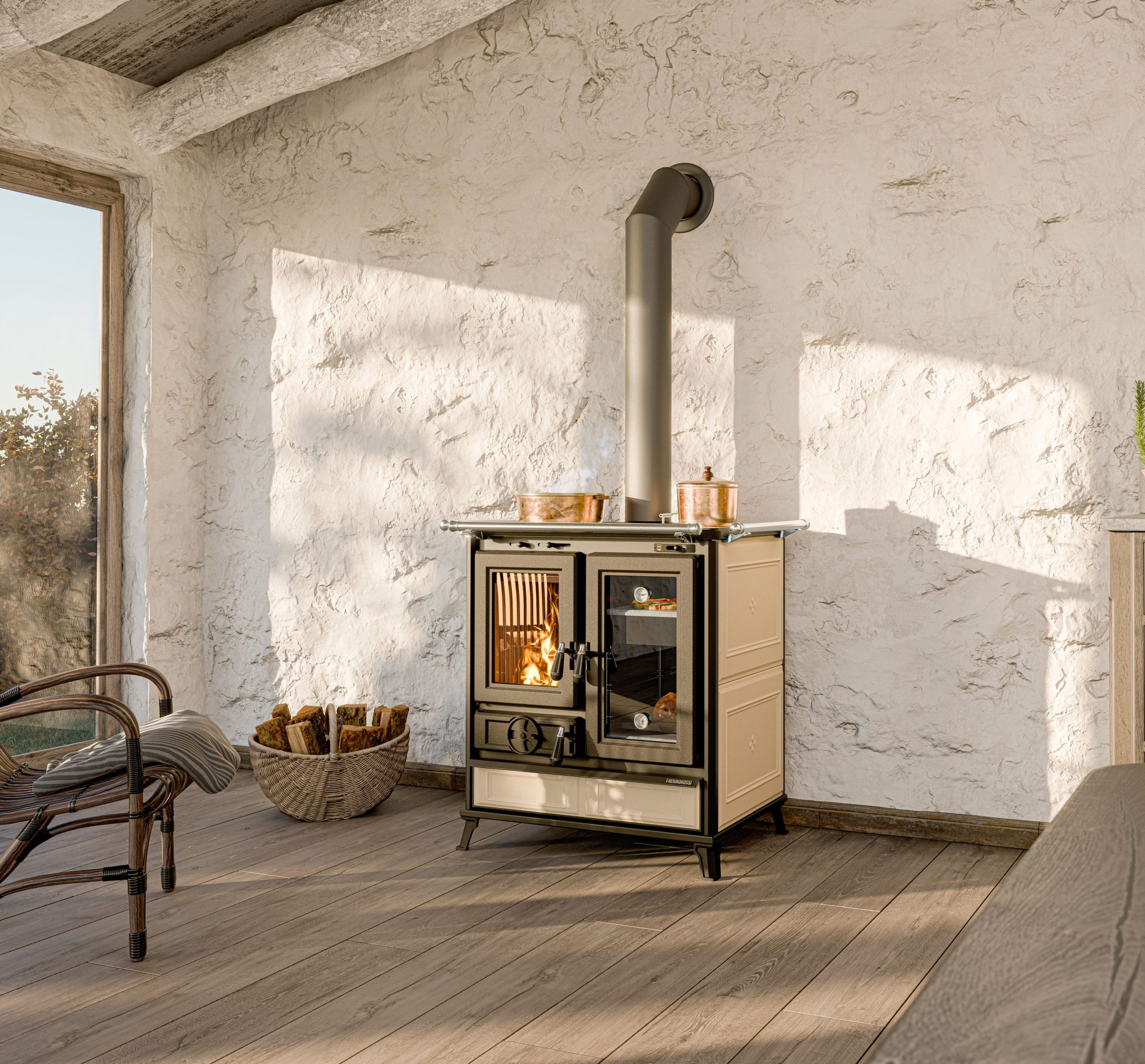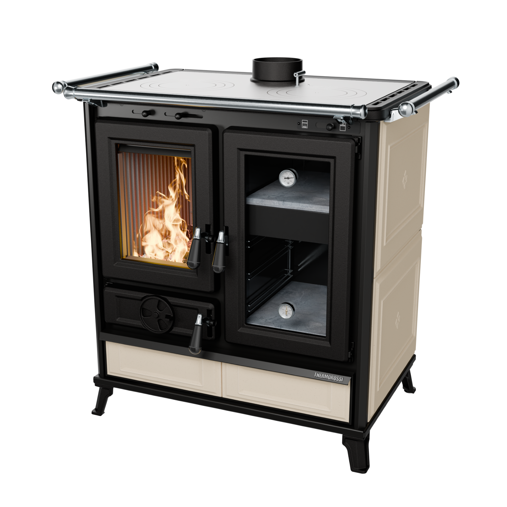 Wood fire cooker made of steel and cast iron with wide exchange surface and long forced smoke path, with a special stainless steel heat exchanger. Smooth cast iron cooking plate, double series of cast iron rings, frontal handrail, oven door with 2 thermometers, lower enamelled oven with lava stone base. Wood/tools storage pan. Both ovens have a soapstone base. Also available in stone and beige.