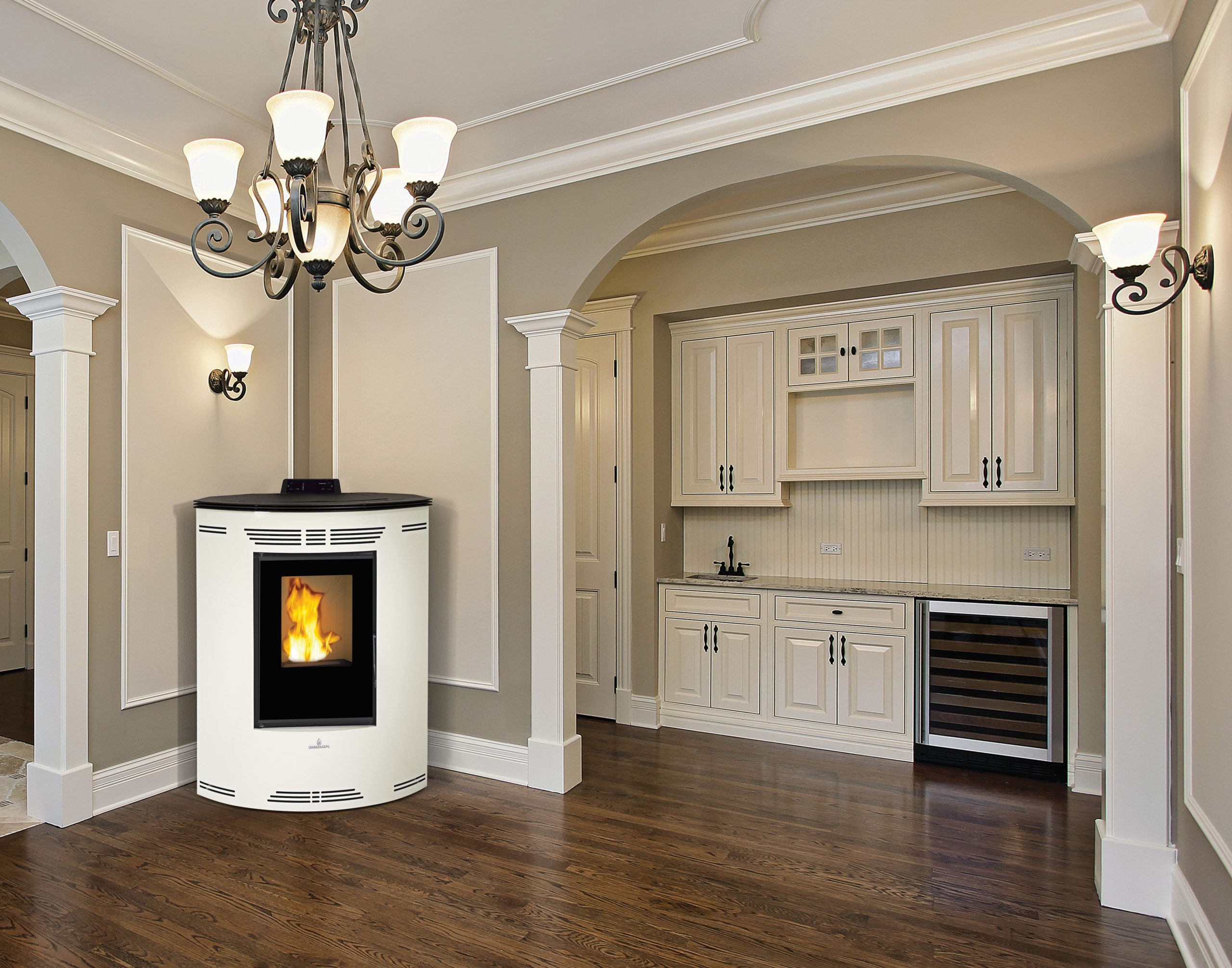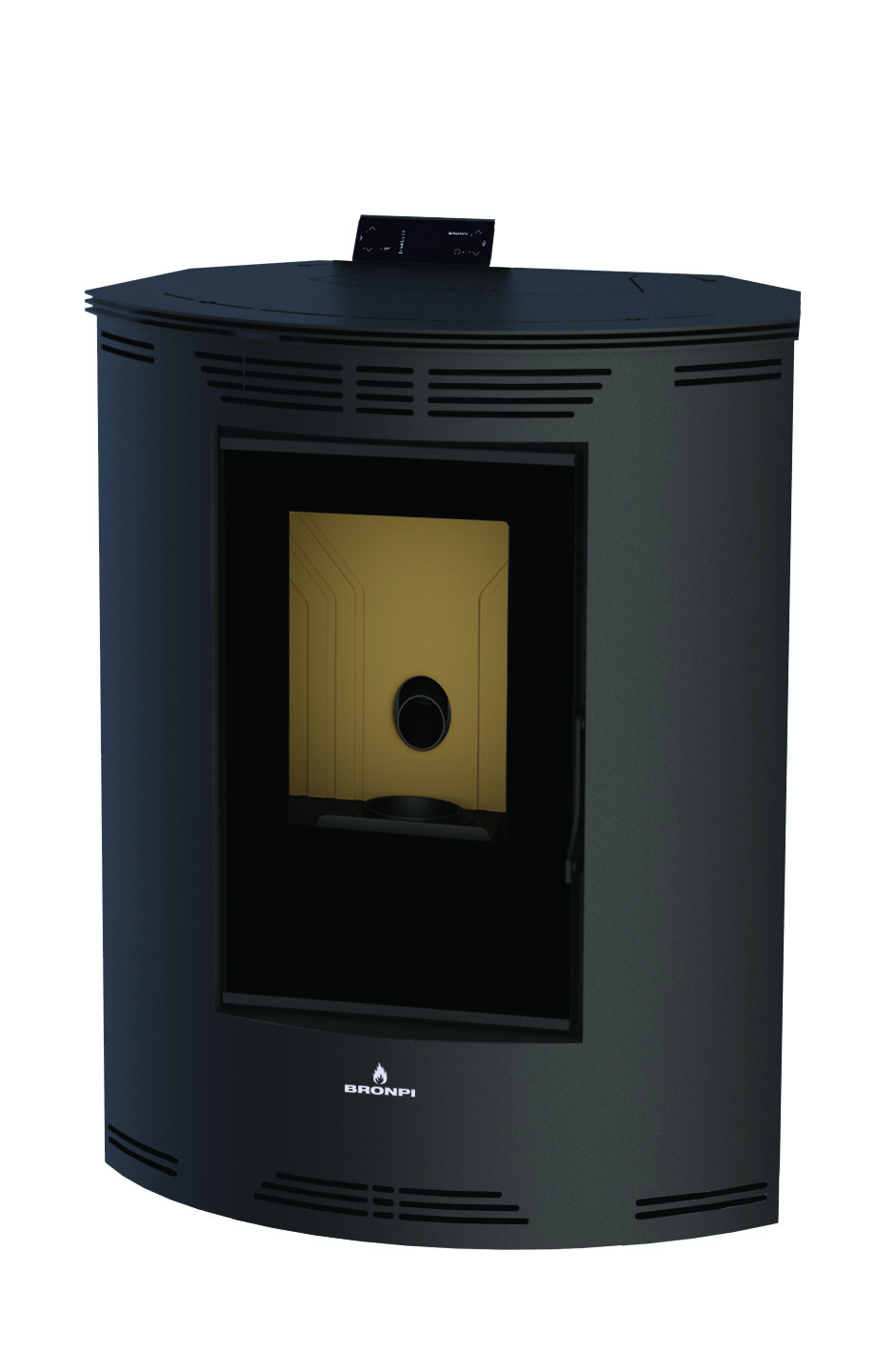 The Bronpi Princesa pellet stove is designed as a corner stove, with a simple and elegant design. It offers a framed view of the fires through a black silk-screened glass ceramic glass. It also includes a cast iron heat exchanger-accumulator for efficient energy use.