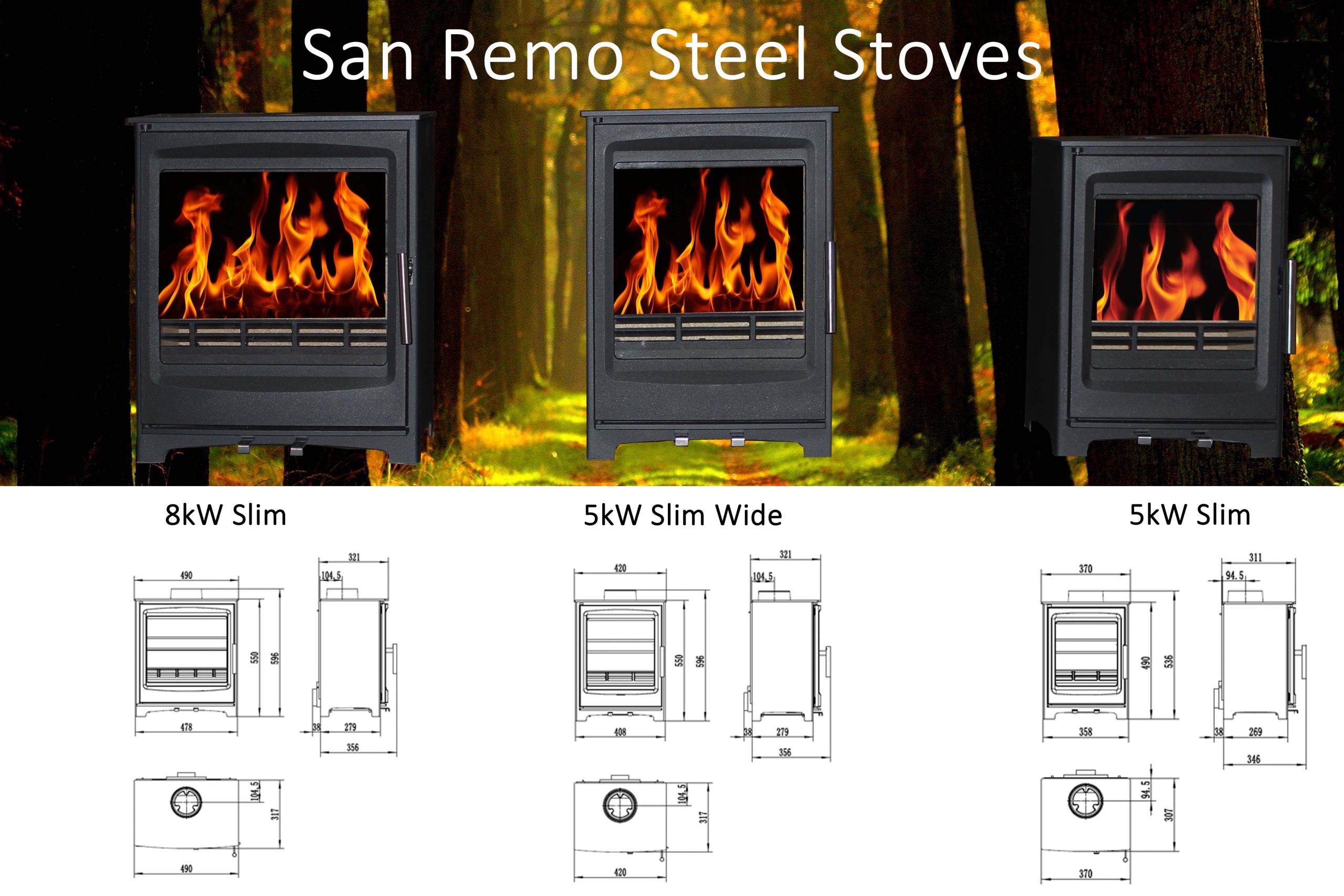 The San Remo 8Kw Slim is a steel bodied stove and is one of the newest addition to the Heat Design collection. The San Remo stove range features clean lines and the introduction of a stainless steel Vitae handle for a modern twist on the traditional look. It has a wide aspect giving a large viewing window through the cast iron door, front controls for ease of control and options for a log store or small plinth. The San Remo 8kW Slim is a multifuel stove capable of burner well seasoned wood or recommended smokeless fuels.