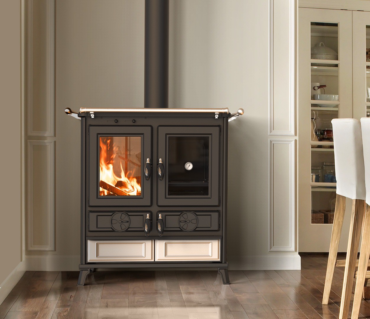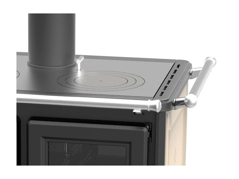 Wood fire cooker made of steel and cast iron with wide exchange surface and long forced smoke path, with a special stainless steel heat exchanger. Top frame in enamelled cast iron with rings, frontal handrail included and side handrail optional.