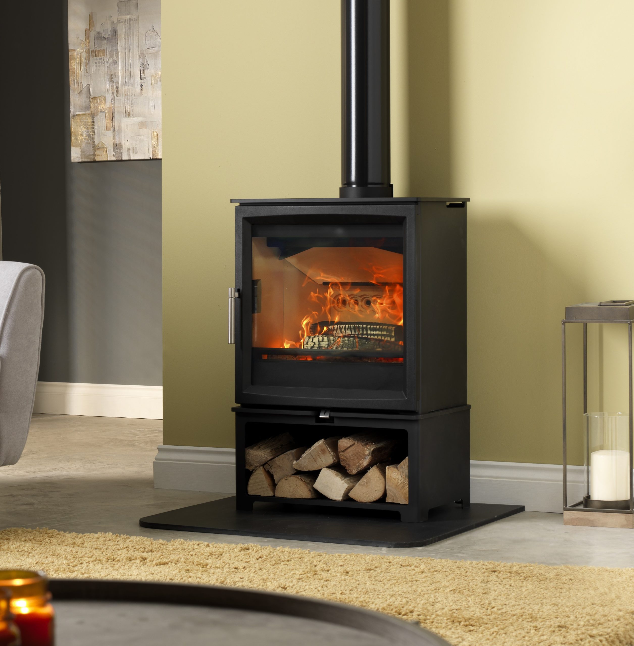 Accentuating the delightful wood fire at its heart. Woodtec is a refined and elegant design, combined with powerful ClearSkies Level 5 certified performance. Easy to operate with a technically advanced single air control and powerful airwash, each of the stoves in the Woodtec range can be customised with optional stands, log stores and black or oak handles, apart from the new Woodtec style models. For total peace of mind, all Woodtec models are Ecodesign Ready, DEFRA exempt for use in smoke control areas, and ClearSkies Level 5 certified. The latest addition is the Woodtec style range, featuring a more traditional style than the current Woodtec range whilst still maintaining the features and usability the Woodtec range is known for. Available with stand or freestanding. Additional log store €400.